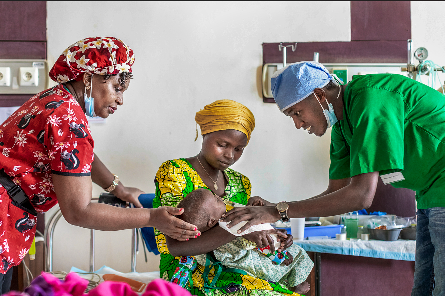PACU-sykepleier Florence Wachira fra Kenya og PACU-sykepleier Nicas fra Rwanda med pasienten Sandrine Akimanizanye på en kirurgisk rotasjon i Rwanda. Foto: Zute Lightfoot.